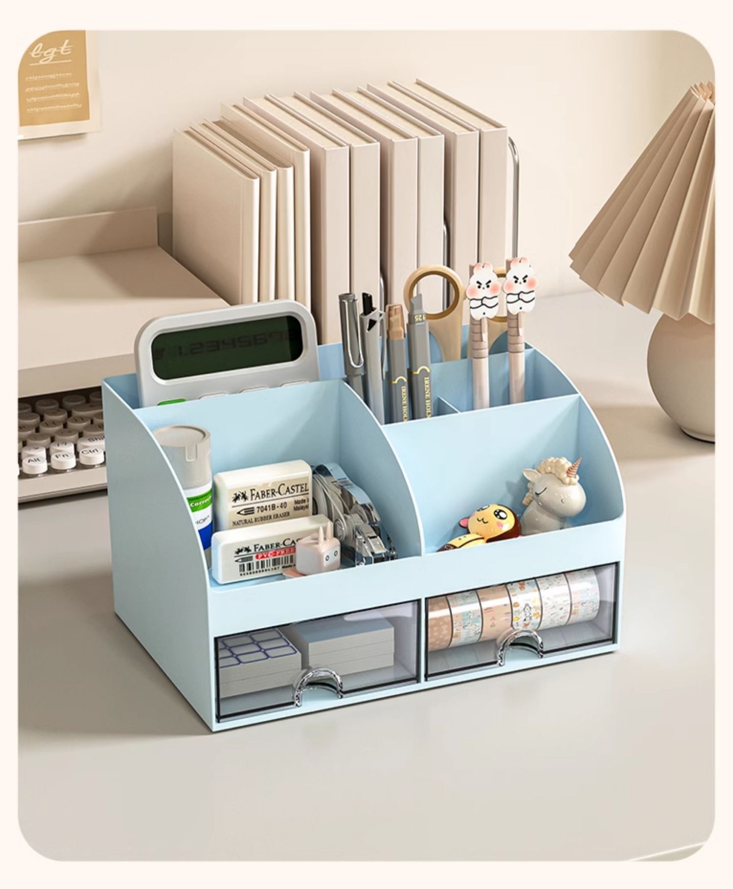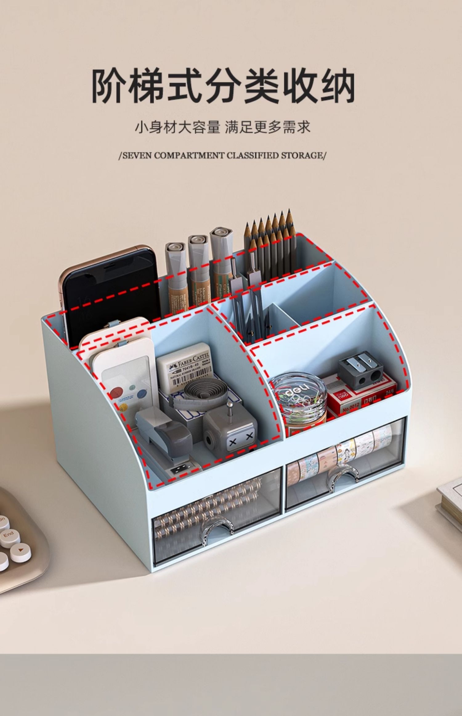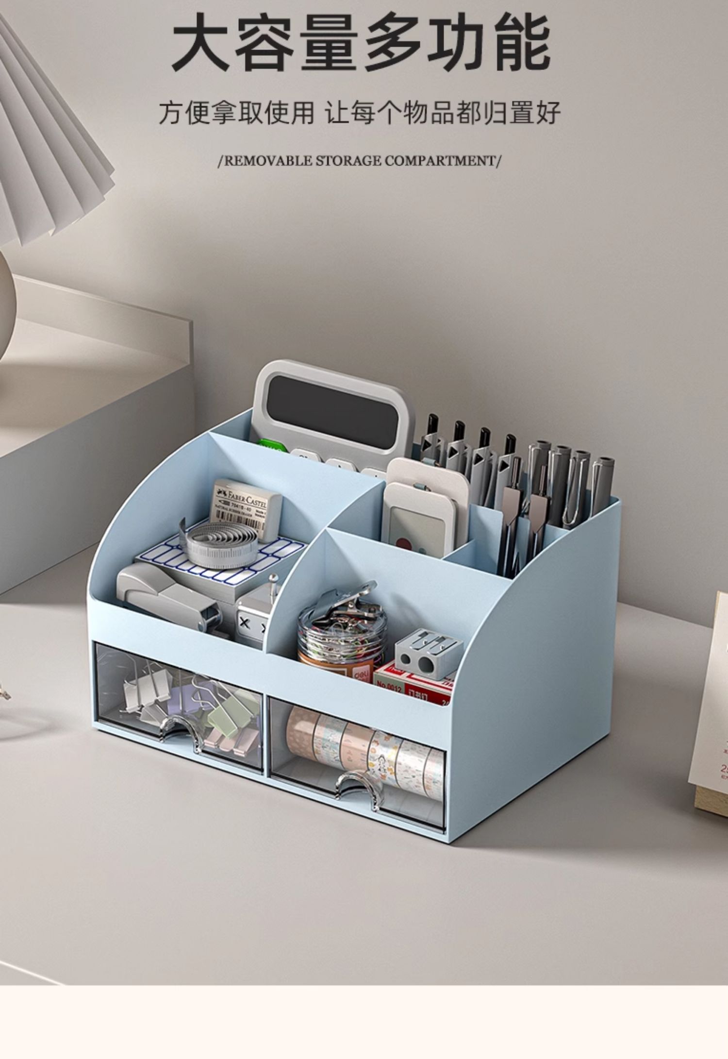 > 化妆品文具桌面收纳盒抽屉学生书桌笔筒工位神器办公室杂物置物架 冰川蓝 带双抽屉+顶部分格