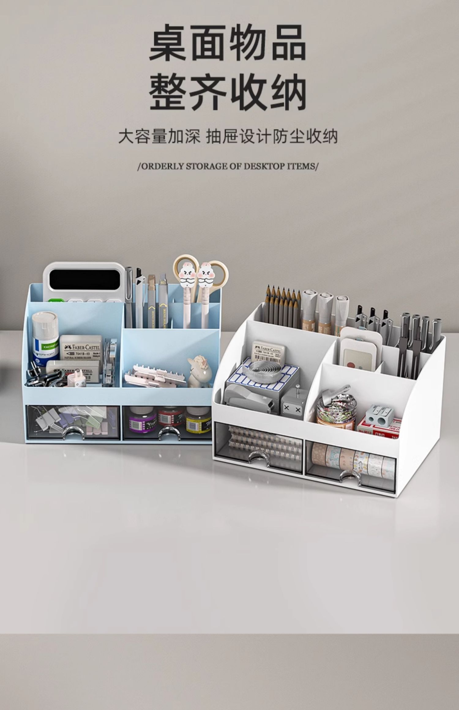 化妆品文具桌面收纳盒抽屉学生书桌笔筒工位神器办公室杂物置物架 冰川蓝 带双抽屉+顶部分格
