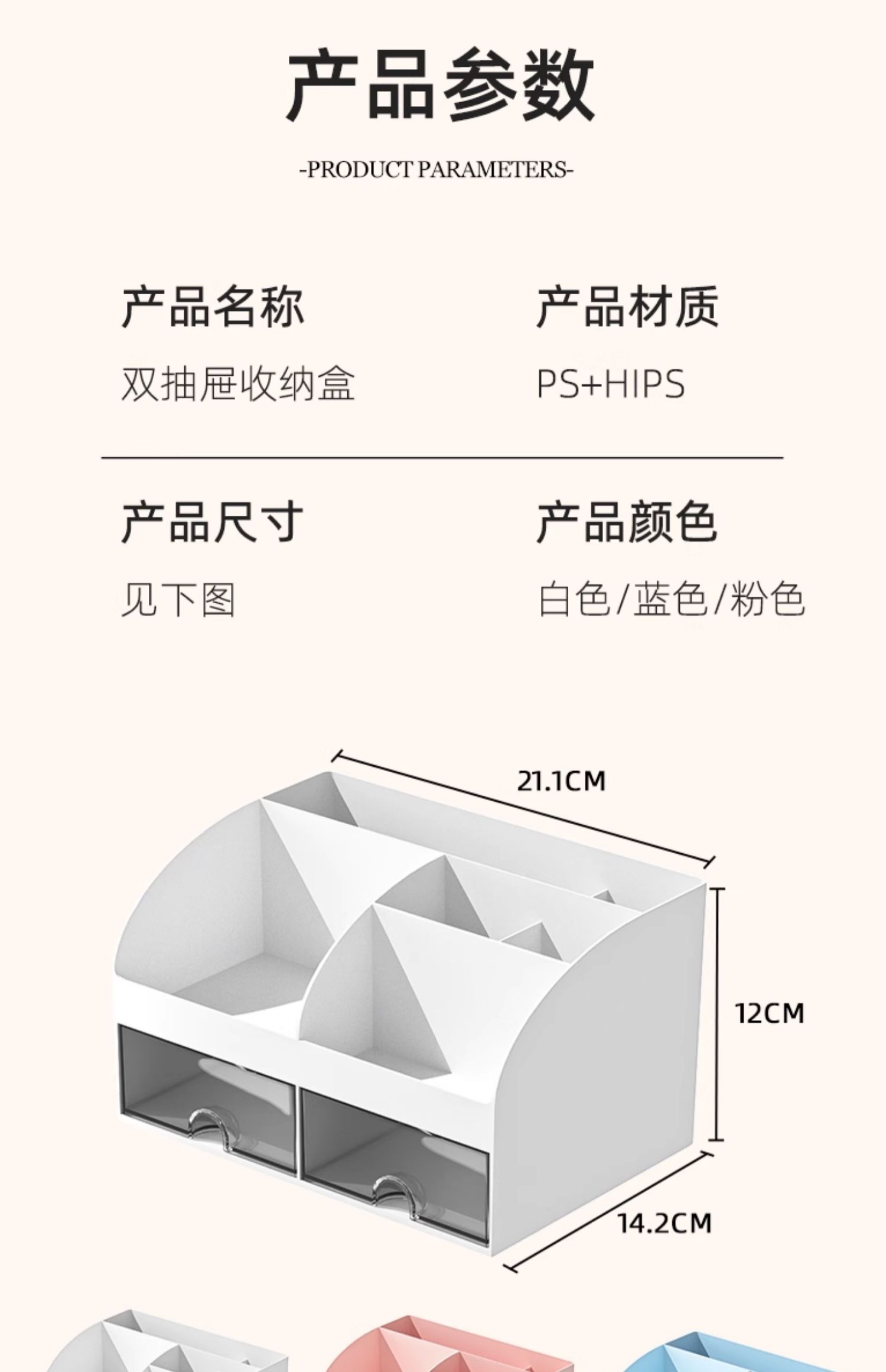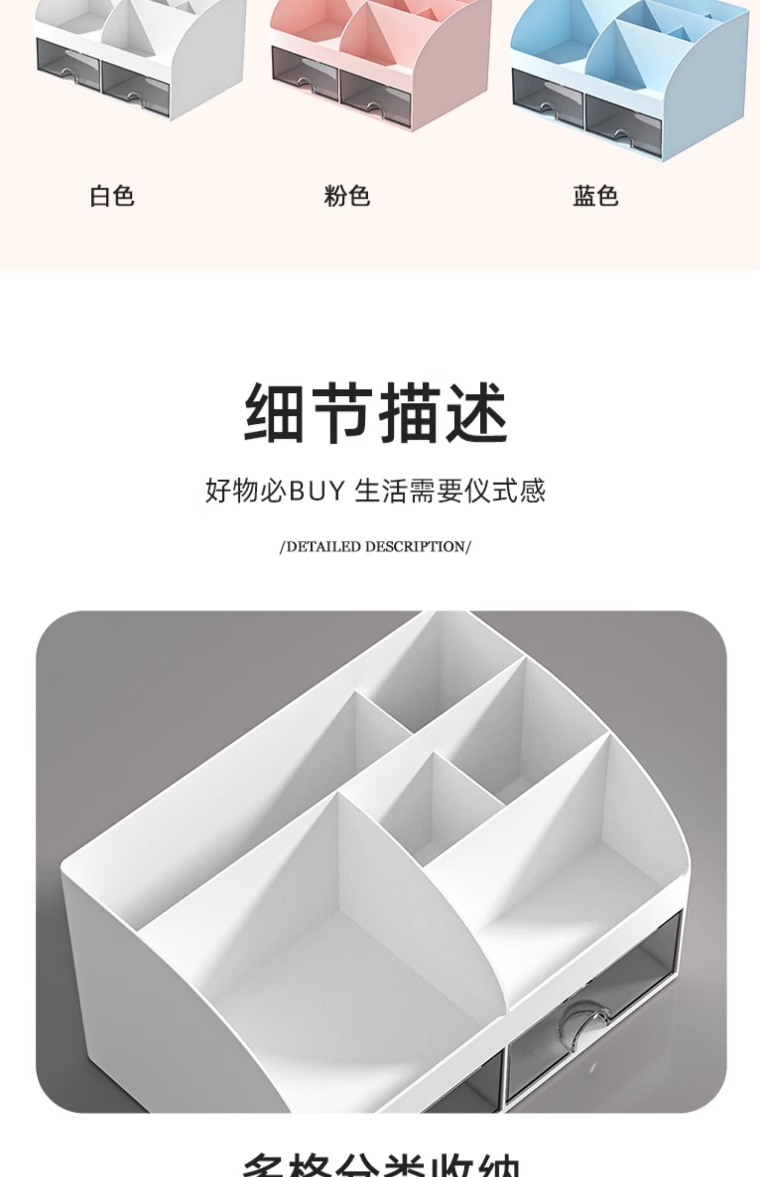 商品名称:化妆品文具桌面收纳盒抽屉学生书桌笔筒工位神器办公室杂物置物架 冰川蓝 带双抽屉+顶部分格